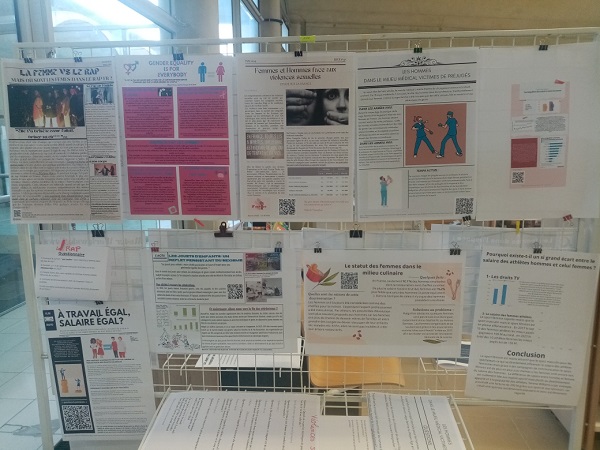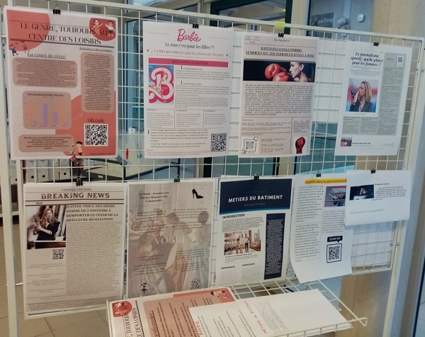 Les 25 « Unes » exposées au CDI abordent le sujet sous des angles variés, comme par exemple les femmes dans la NASA, les maïeuticiens (hommes exerçant le métier de sage-femme), les femmes dans la boxe, les inégalités face à la garde des enfants, la place des femmes dans le journalisme sportif, les différences de salaires, les femmes dans le Rap, les femmes réalisatrices dans l’histoire des César, les stéréotypes sexistes dans les jeux vidéo, etc… sans oublier le film Barbie.