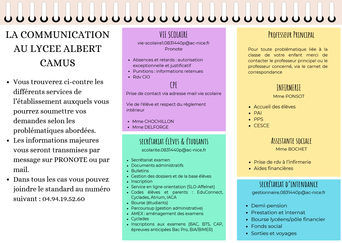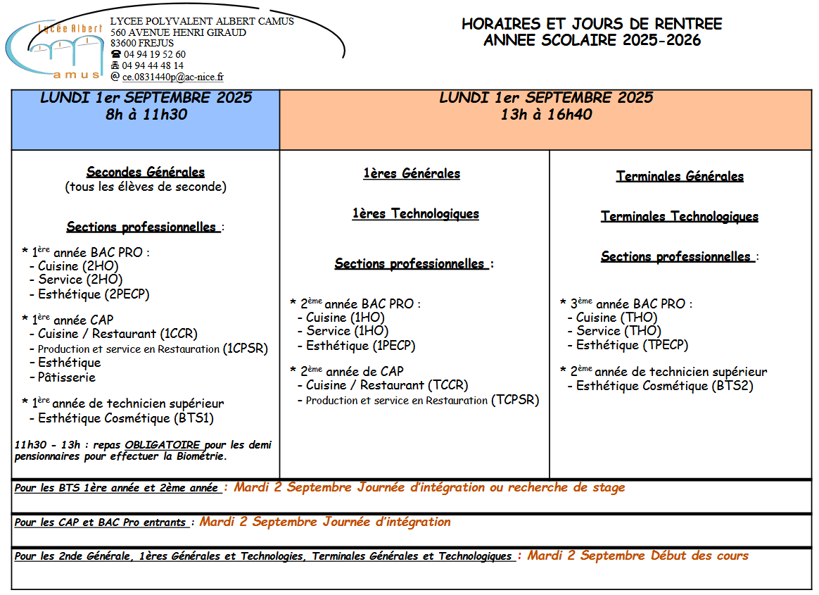 Concernant l'organisation au lycée Albert Camus, le déroulement de la journée de lundi 1er septembre est donc décalé au mardi 2 septembre aux mêmes horaires.